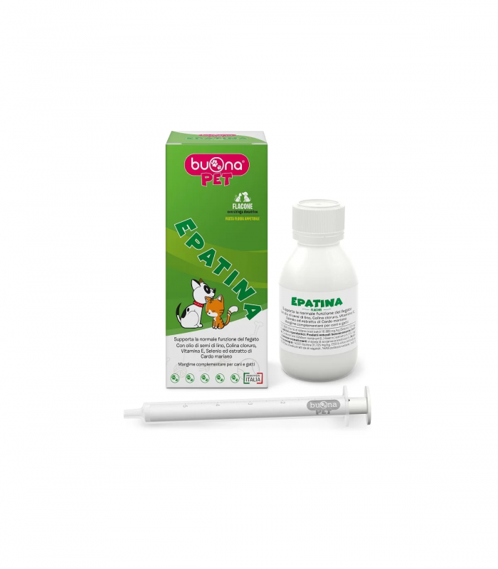 EPATINA Flacone è un mangime complementare per cani e gatti in forma liquida appetibile, contiene olio di semi di lino, Colina cloruro, Vitamina E, Selenio ed estratto di Cardo mariano (Sylimarin phytosome® Indena-Milano) a supporto della normale funzione del fegato.