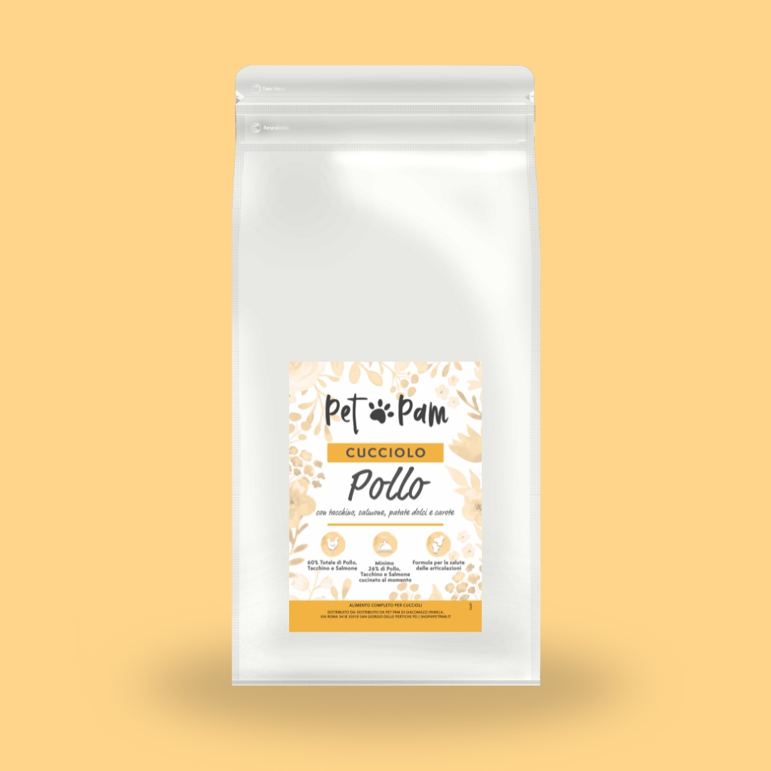 Alimento completo per cuccioli al pollo, tacchino e salmone.