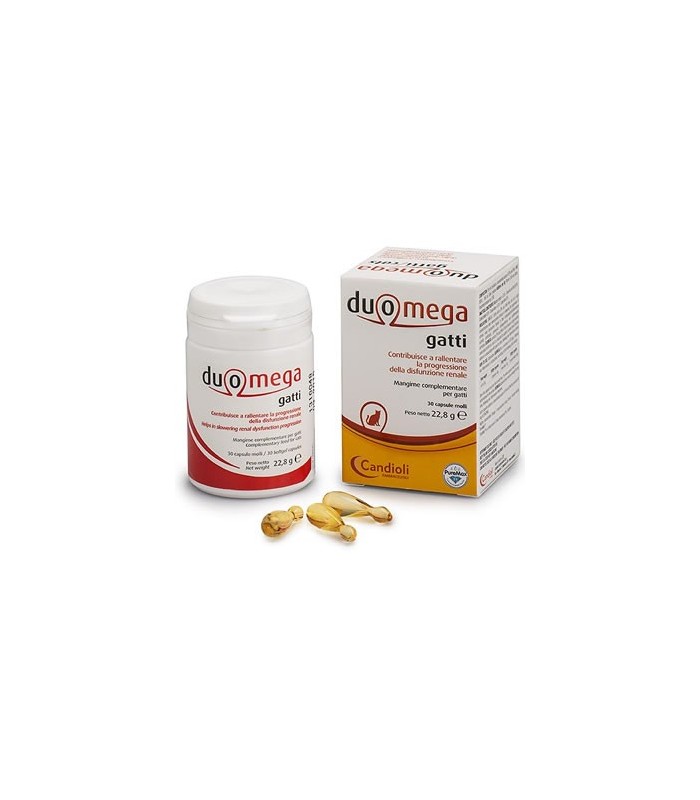 Candioli duomega gatti 30 capsule, contribuisce a rallentare la progressione della disfunzione renale. Duomega contiene un’elevata concentrazione di EPA e DHA di origine naturale (PESCE MARINO) associati all’olio di KRILL ed è indicato come supporto per il corretto mantenimento della funzionalità renale.