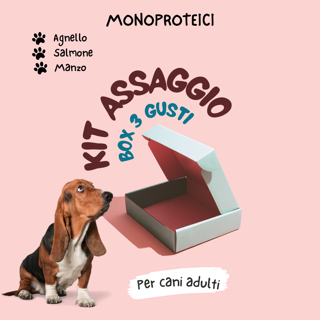 Kit assaggio 3 gusti monoproteici in porzioni da 100g per CANI ADULTI