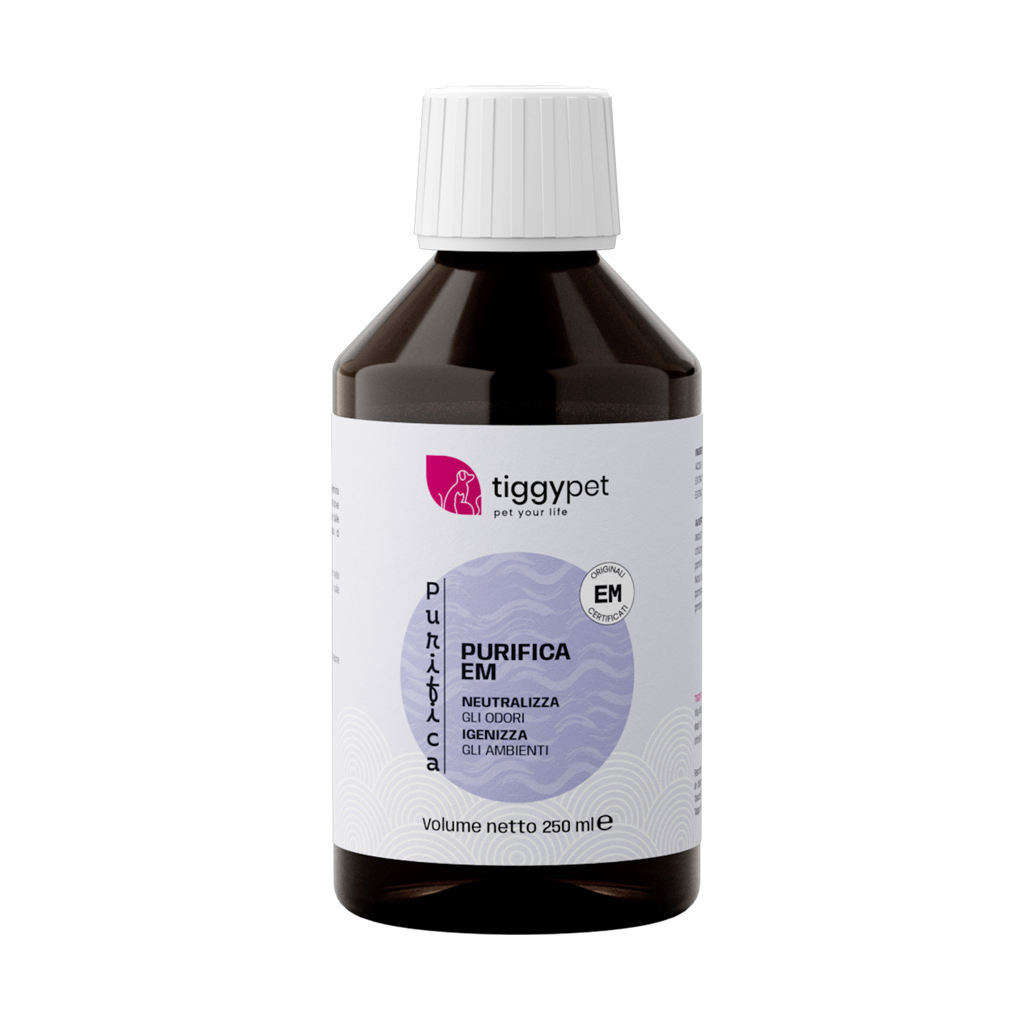 PURIFICA EM , grazie all’ esclusiva tecnologia EM, elimina gli odori sgradevoli in pochi minuti dall’ambiente dove vivono gli animali, dalla cuccia, dalla ciotola e dalle lettiere dei gatti neutralizzando il processo di decomposizione e i cattivi odori. Istruzioni per l’uso: Spruzzare 1-2 volte al giorno nella cuccia o nel luogo in cui riposano i cani e i gatti e sulla lettiera dei gatti. INGREDIENTI: Acqua, Molasses, Lactic Yeasts, Citrus Sinensis Extract, Citrus X Paradisi Extract, Citrus Bergamia Extract. AVVERTENZE: Conservare al buio in un luogo fresco e asciutto.